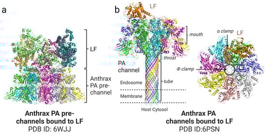 Cryo-EM structure models of Anthrax PA prechannel-LF and PA channel–LF complexes. (a) Ribbon representation of Anthrax PA8 prechannel–LF4 complex viewed from the side and colored by subunits. (b) Ribbon representation of Anthrax PA7 channel–LF complex viewed from the side (left) and top (right) and colored by subunits. All the protein structural models were generated using the program PyMOL (https://pymol.org/2/ (accessed on 13 March 2023).).