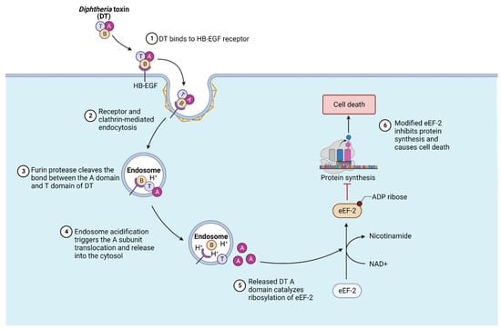 Diphtheria toxin translocation mechanisms. Diphtheria toxin (DT) binds to the cell surface receptor HB-EGF receptor and then becomes internalized via clathrin-mediated endocytosis. Within the endosome, the proteases partially cleave the bond between the DT domains. Endosome acidification triggers the translocation of the A subunit of DT into the cytosol. A subunit of DT catalyzes the ribosylation of the eukaryotic EF-2 (eEF-2) protein, which inhibits the host cell protein synthesis and thus induces cell death. This image was adapted from “Mechanism of Action-Diphtheria Toxin” by BioRender.com (2023), accessed on 1 May 2023. Retrieved from https://app.biorender.com/biorender-templates, accessed on 1 May 2023.