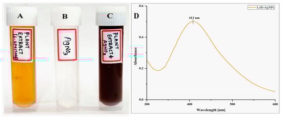 The aqueous flower bud extract of Ls-AgNPs was minced with one mM silver nitrate (AgNO3) suspension in a ratio of 1:8 at pH 9.0 to synthesize Ls-AgNPs. After 24 h of the incubation period, the reaction mixture turned dark brownish from pale yellow, indicating proper synthesis and fabrication of Ls-AgNPs (Figure 2A–C). Due to phytochemicals’ reduction and capping action in the flower bud extract, silver ions (Ag+) were bio-reduced into elemental silver (Ag°) and capped and stabilized. Synthesized Ls-AgNPs produced a characteristic absorption spectrum at 413 nm, suggesting metallic silver’s surface plasmon resonance (SPR) range (Figure 2D).