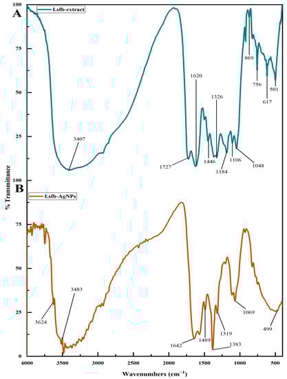 (A) FTIR spectrums of L. speciosa flower bud extract and (B) synthesized Ls-AgNPs showing the presence of functional groups.