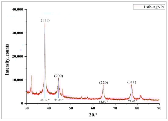 The crystalline nature of Ls-AgNPs was determined through X-ray diffraction analysis, which exhibited distinct Bragg’s reflection planes. The XRD pattern illustrates the primary reflection planes at 2θ, with corresponding values of 38.17°, 44.34°, 64.50°, and 77.43°, as shown in Figure 4. The XRD analysis revealed that the metallic silver possessed a face-centered cubic (FCC) crystalline nature, as evidenced by identifying the 111, 200, 220, and 311 facets of Bragg’s planes.