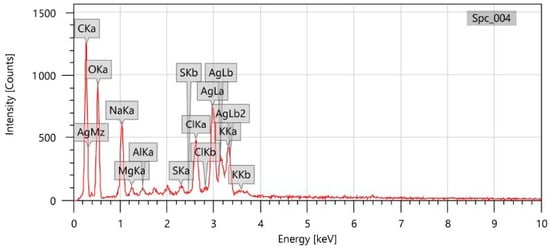 The EDX spectrum of Ls-AgNPs exhibited 39.80% of Ag in the sample. This also demonstrated the reduction of Ag+ ions to Ago by generating a major peak at 3 keV. The EDX spectrum also revealed the existence of other metals, such as carbon, chlorine, sodium, potassium, etc. Similarly, the AgNPs obtained from Syzygium aromaticum (Clove) extract demonstrated a strong signal for Ag with other peaks for calcium, carbon, oxygen, chlorine, potassium, etc. The elemental peaks, apart from Ag, were observed due to the presence of bio-molecules on the surface of AgNPs involved in the capping and stabilization; the peaks for carbon and oxygen might be due to the plant materials and atmospheric moisture [].