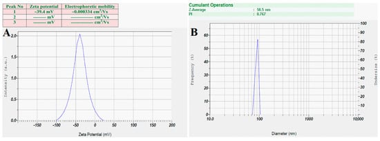 The synthesized Ls-AgNPs were dispersed in an aqueous colloidal medium at ambient temperature, and the resulting zeta potential was determined to be −39.4 mV (Figure 7A). The Ls-AgNPs synthesized through biosynthesis were observed to possess a negative zeta potential. This observation suggests a repulsive force among the silver nanoparticles that were synthesized through green synthesis, which ultimately leads to an increase in their stability. The high negative zeta potential of silver nanoparticles results in their poly-dispersed nature. The electrostatic repulsion between nanoparticles impedes their agglomeration, thereby promoting term stability. The dynamic light scattering technique is commonly employed to ascertain silver nanoparticles’ dimensions and dispersion characteristics of AgNPs. The mean size of Ls-AgNPs was determined to be 58.5 nm, as illustrated in Figure 7B.
