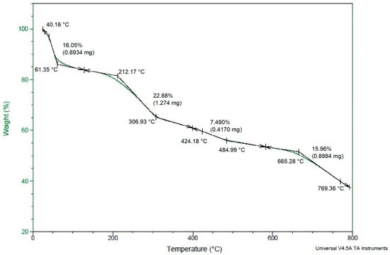 The thermal properties and decomposition of Ls-AgNPs synthesized through the biological process were analyzed using a TGA instrument (SDT Q 600, New Castle, DE, USA). A predetermined amount of Ls-AgNPs was introduced into the furnace at ambient temperature (approximately 27 °C) and subjected to a gradual temperature increase up to 800 °C, with a heating rate of 10 °C/min, In contrast, inert nitrogen gas (at a flow rate of 40 mL/min) was passed over the sample, as described in references [,].
