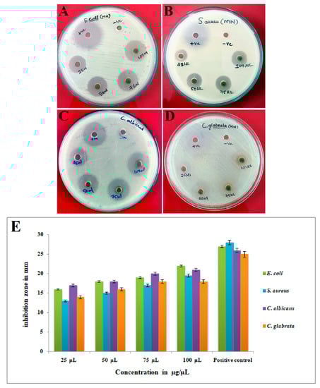 Antimicrobial activity of Ls-AgNPs biosynthesized from the flower buds extract (A) E.coli, (B) S. aureus, (C) C. albicans, (D) C. glabrata, and (E) graph showing the zone of inhibition for Ls-AgNPs.