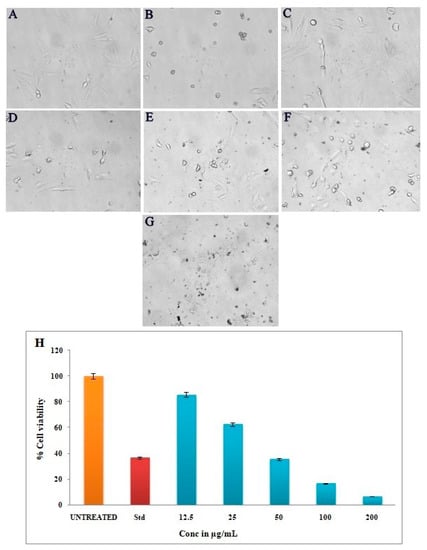 MTT assay of different volumes of biosynthesized Ls-AgNPs: (A) untreated cells, (B) standard control, (C) 12.5 μg/mL, (D) 25 μg/mL, (E) 50 μg/mL, (F) 100 μg/mL, (G) 200 μg/mL, and (H) bar graph showing comparative cell viability percentages.