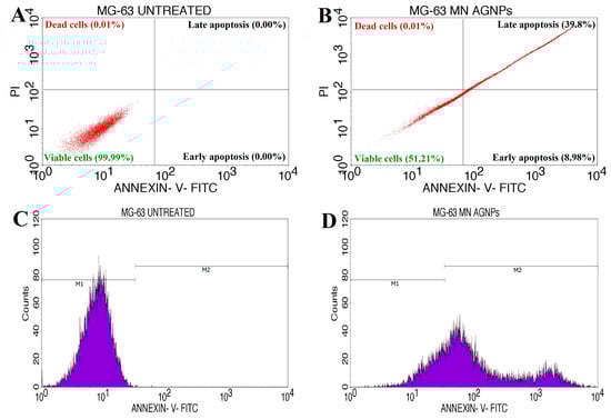 A test was performed to assess the occurrence of apoptosis/necrosis in the MG-63 cell line following treatment with a synthesized Ls-AgNPs solution at the IC50 concentration. The aim was to determine the extent of early and late apoptosis. The neoplastic cells were subjected to FITC Annexin V/PI staining, and the determination of early and late apoptotic cells was validated via flow cytometry using fluorescent activated cell sorting (FACS), as depicted in Figure 11A,B. The study revealed that the induction of apoptosis in cancer cells was observed upon treatment with Ls-AgNPs at an IC50 concentration of 37.57 µg/mL for a duration of 24 h. The treated cells exhibited a substantial increase in the population of early apoptosis cells (8.98%) and late apoptosis cells (39.8%), while the untreated cells did not exhibit any significant apoptosis. Figure 11C,D depicts the analysis of cell cycle arrest during the M1 and M2 phases. The results indicate that the cells not subjected to any treatment exhibited a viability of 99.95% for M1 and 0.05% for M2, as illustrated in Figure 11C. In Figure 11D, it can be observed that M1 accounted for 25.28% of the viable MG-63 cancer cells, while M2 comprised 74.72% of the damaged cells.