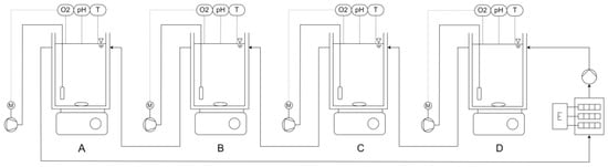 Schematic illustration of the experimental set up for inhibition assessment with the four reactors A, B, C and D, controllable air pumps (marked M), electric heating (marked E) and the associated measurements of DO (O2), pH and temperature (T).