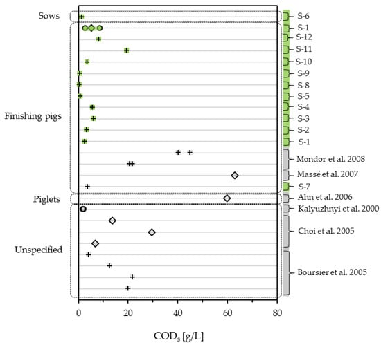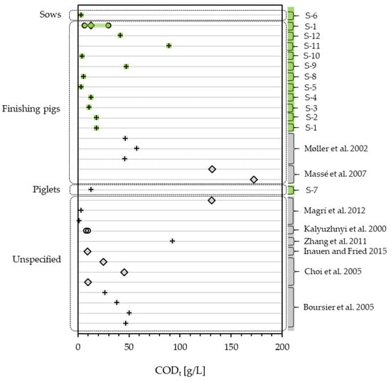 CODs of pig slurry measured in this study (green) compared to literature values (grey) [,,,,,], differentiating between one-time samples (+), mean values (◊) and ranges (o).