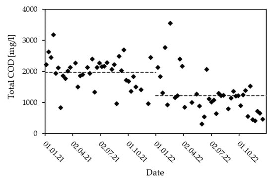 The pH, EC, LOI, the Biological Oxygen Demand after 5 days (BOD5) and total Kjeldahl nitrogen (TKN) do not differ drastically in terms of their variation and annual mean when comparing the three years considered. While mean TSS is similar in all years, the maximum measured in 2018 lies far below the maxima of 2021 and 2022. Moreover, a rise in CODt from 2018 to 2021 is apparent, as well as a small drop in mean NH4-N. Unfortunately, no information on any operational changes in this time period was supplied. Noticeably, there is also a drop in CODt between 2021 and 2022 of 740 mg/L in the annul means, a 36.7% decrease. Figure 5 shows the measured CODt in 2021 and 2022, as well as the annual means represented by a dotted line. The data shows two fairly stable levels with a period of greater variability around the turn of the year. In November 2021, the degree of drying was reduced from 42% to 39% and in the beginning of 2022 the polymer, used to facilitate sludge dewatering, was changed. Moreover, the use of glycerol as a co-substrate was drastically reduced in the beginning of 2022. The decrease in degree of drying is not pronounced enough for a reduction in CODt, as described by Brautlecht []. The drastic reduction in glycerol as co-substrate makes for a better explanation, with glycerol having an extremely high COD of up to 1600 g/L []. The CODt:NH4-N ratio in the condensates ranged from 0.4 to 1.7 in 2018, from 0.5 to 1.7 in 2021 and from 0.2 to 1.9 in 2022, with an annual mean of 0.8, 1.0 and 0.6, respectively. As in the samples of the characterization, this favors a carbon-independent treatment. Additionally, the CODt seems not to be readily degradable as the mean BOD5: CODt ratios of 0.21 (2018), 0.15 (2021) and 0.23 (2022) suggest.