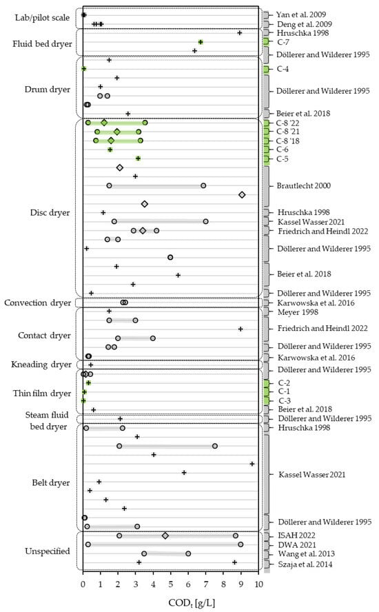 When comparing the CODt measured in this study with the literature dealing with full-scale dryers, a great variation in CODt becomes apparent. The broadest range reported in the literature spans from 0.3 to 9 g/L and includes almost all values regarded in this study, though ranges from single operations tend to be less broad [,,,]. The range is stated by the German Association for Water, Wastewater and Waste (DWA) [] as a generally expectable range, not regarding the type of dryer. In this study, CODt ranges from 0.054 to 8.950 g/L. In the literature, the lowest reported CODt lies at 0.059 g/L, being the low end of a range reported by Döllerer and Wilderer [] of a continuous operation of a thin-film dryer with a maximum of 0.443 g/L and an annual average of 0.177 g/L. The highest value found in literature, for a large-scale dryer, is a one-time sample of a belt dryer scoring 9.647 g/L []. Figure 6 gives a comprehensive overview of the CODt found in the examined samples and the condensate monitoring set in context with the literature, differentiating by dryer type. The widest range of CODt can be found in condensates from belt dryers, spanning almost over the whole range presented in the literature, with 0.107 g/L [] as its lowest value. The most records for CODt in condensates derive from disc dryers. Mostly the CODt lies below 5 g/L, both one-time samples and the ranges recorded in this study’s condensate monitoring. Where data on a continuous drying operation of disc dryers is available, the CODt spans over a minimum range of 2.334 g/L (C-8 ‘21) and a maximum range of 5.375 g/L []. Regarding the ranges found in large-scale drying operations, the effect of temperature on CODt reported from lab experiments by Deng, Yan et al. [] and Yan, Deng et al. [] is dwarfed. Data on drum dryers show a maximum of 2.573 g/L CODt []. Noticeably, CODt in condensates derived from thin-film dryers score lowest in the comparison with a maximum of 0.628 g/L []. On the other end lie the condensates derived from fluid bed dryers, with a minimum in one-time samples of 6.37 g/L [] and a maximum of 8.95 g/L (C-7).