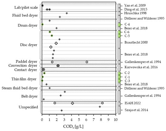 Even though condensates are less loaded with solids compared to slurries, a lowering of CODt is still achievable with de-dusting or filtration. While most of the condensates where data on CODt and CODs are available have a portion of up 80 to 98% CODs in CODt, there are condensates with as little as 21% CODs []. CODs in the condensates range less widely than the CODt. The lowest value measured in this study is 0.053 g/L (C-3), while the lowest reported in the literature is 0.109 g/L [] as the low end of a range for contact dryers. The maximum value was the high end of an operating range with 8.215 g/L []. Operating ranges show a variation over a span of 4.7 g/L [] and 6.45 g/L []. With CODs in the literature, mostly being reported as one-time samples, it makes for a difficult placement of the measured values in this study. Figure 7 shows the CODs measured in this study and CODs presented in the literature, differentiating by dryer type. The CODs in condensates derived from disc dryers lie between 1.0 and 2.5 g/L with six one-time samples (S-5, S-6, [,]) and two mean values []. As with CODt, the values available for thin-film dryers score the lowest with a maximum of 0.621 g/L []. Except for one, all one-time samples considered (6 samples + 15 literature values) lie below 3.5 g/L, the exception being a one-time sample reported by Szaja, Aguilar et al. [] with a CODs of 7.85 g/L.