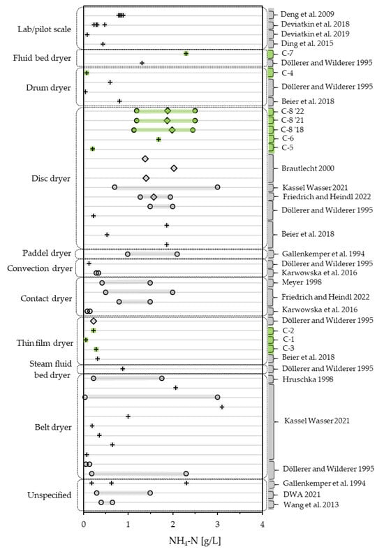 As the other parameters do, NH4-N values in the literature spread over a wide range from 0.039 g/L to 3.11 g/L [], including all one-time samples measured in this study as well the monitoring data. Almost half of the values of large-scale dryers considered in this study (21 of 48) exceed the range for the expectable range of NH4-N in condensates of 0.3 to 1.5 g/L, stated by DWA [], these values being one-time samples [,,,] or the high ends of ranges [,,,,] reported in literature as well as C-7 and the annual means in monitoring data from this study. Except for one one-time measurements (3.11 g/L []) and the high ends of two ranges with 3 g/L [], all NH4-N values considered lie below 2.5 g/L. This also includes the values reported in lab experiments [,,,]. Figure 8 shows the values measured and recorded in this study in comparison to the values found in the literature, differentiating by dryer type. The monitoring data fit in well, considering other values found for disc dryers. NH4-N minima and maxima in the recorded data span over a range of 1.31 g/L (C-8 ‘18) and 1.30 g/L (C-8 ‘21, C-8 ‘22) and lie in between the ranges of 0.674 g/L [] and 2.3 g/L [] reported for disc dryers. Ranges reported in the literature generally span over a minimum of 0.25 g/L [] up to a maximum span of 2.961 g/L []. As with CODt and CODs, the range in large-scale operations seem to dwarf the effect of drying temperature on the NH4-N content of condensates as reported by Deviatkin, Havukainen [] and Deng, Yan et al. []. Out of the seven one-time samples measured in this study, five values (C-1, C-2, C-3, C-4, C-5) range at the low end of the spectrum of considered values with 0.059, 0.228, 0.286, 0.076 and 0.207 g/L, while C-6 (1.690 g/L) sits fairly in the middle and C-7 (2.3 g/L) ranging on the high. As with CODt and CODs, thin-film dryers score noticeably low.
