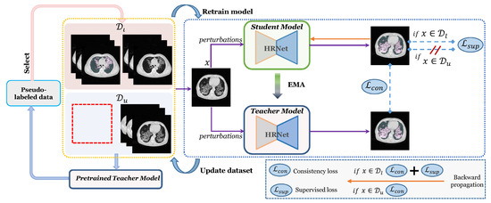A consistency loss is often used to force the teacher and the student to make stable and consistent predictions on labeled and unlabeled data under various perturbations. We adopt the mean square error (MSE) in Equation (6) as the consistency loss, where and correspond to the predictions of the teacher and student models, respectively. Thus, the total loss function of the segmentation model can be expressed as