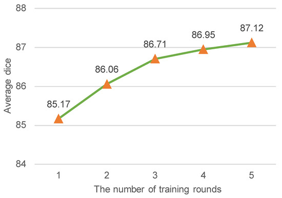 The average dice coefficient (%) vs. the number of training rounds. The average dice indicates the mean segmentation performance of the model for 8 ILD patterns. Intuitively, the improvement of dice coefficient becomes less pronounced after a certain number of training rounds. To achieve a balance between segmentation performance and training time, the training rounds were limited to 3 in this study.