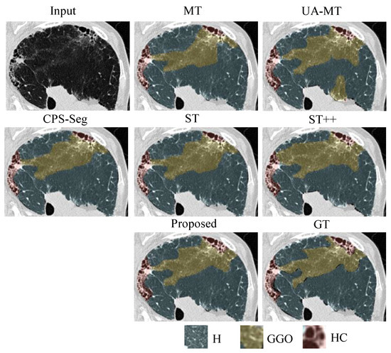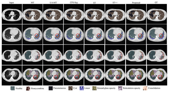 Clinical high-resolution CT scans from 67 pneumonia patients were collected from the First Affiliated Hospital of Guangzhou Medical University from 2015 to present. All cases were clinically diagnosed as pulmonary alveolar proteinosis (PAP), usual interstitial pneumonia (UIP), or lymphangiomatosis (LAM) with ILD lesions. The number of slices in each CT scan ranged from 127 to 339, with a resolution of and a pixel size ranging from to mm. To ensure the quality and relevance of our dataset, we selected cases that met three inclusion criteria: (a) the subjects had to be diagnosed with ILDs in multiple disciplines; (b) the CT scans were acquired by spiral CT and reconstructed by a high-resolution algorithm, with slice thicknesses of 1–2 mm; (c) there were no other concurrent lung diseases, such as infection, pneumoconiosis, tumor, etc. Then, to generate ground-truth segmentation masks, two radiologists with 7 and 19 years of experience were invited to annotate the ILD patterns in the dataset. Notably, a slice-wise with pixel-level sparse annotation method was adopted in our work, i.e., only labeling a few slices for each CT scan and the annotation covers the entire lung region for the slices selected by the two radiologists. This kind of annotation could alleviate the labeling burden on radiologists as well as increase the diversity of the labeled dataset. In CT images, the features of adjacent slices are often highly correlated, and lesions typically appear consecutively across adjacent slices, so we selected unlabeled slices from 3 upper and lower areas of the labeled slice as unlabeled data to train our model. In such a way, a total of 11,493 CT images are included in our work, of which 2132 images are fully annotated. All comparison methods follow the same data partition divided on the patient basis, including 1732 labeled and 7360 corresponding unlabeled images as the training set, 200 labeled images as the validation set, and 200 labeled images as the test set. All annotated areas contain 8 types of lung patterns with ILDs, including Healthy (H), Honeycombing (HC), Pneumothorax (Pne), Cyst, Linear (Line), Ground-glass opacity (GGO), Reticular opacity (RO), and Consolidation (Cons).