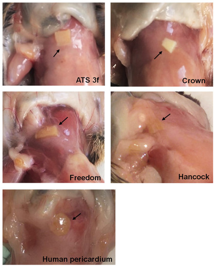 Pathological studies of BHV tissues in adult Gal KO mice at 2 months post-implantation. Representative images of macroscopic examination of adult mice grafted with ATS 3f (n = 10), Crown (n = 8), Pericarbon Freedom/Freedom Solo (Freedom, n = 9), Hancock II (Hancock, n = 7), and human pericardium (n = 7). The BHV-tissue locations are indicated with arrows.