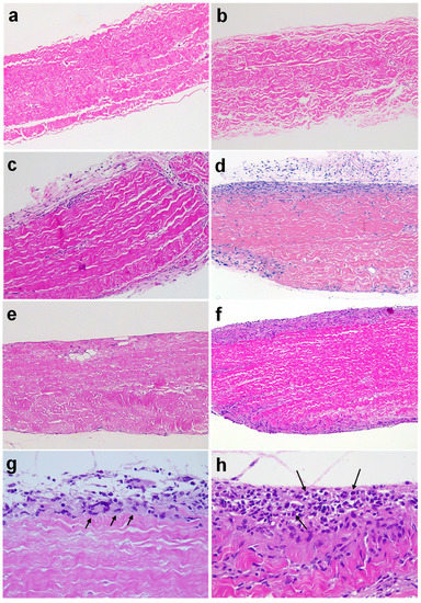 Grafts were surgically retrieved at 2 and 4 months post-implantation. Gross examination at 2 months showed that implants were well preserved and surrounded by the vascularized soft tissue of the recipient (Figure 1). Histological analysis was subsequently conducted after H&E staining of paraffinated tissue (Figure 2). The internal tissue structure was intact with well-organized fibers and the presence of nuclei as in non-implanted tissue (Figure 2a,b,g). However, a cellular immune response was observed with a predominance of macrophages progressing from the edges into the explanted pieces (Figure 2c–h). Some lymphocytes, plasma cells, and a few giant cells (generated by the fusion of macrophages against the tissue) were also found within the immune infiltrate (Figure 2g,h). Overall, the amount of cellular immune infiltrate observed in retrieved BHV tissues was higher at 2 months post-implantation (Figure 2c–f), whereas loss of structure and tissue quality became readily visible in some cases after 4 months. Furthermore, the loss of BHV tissue paralleled the amount of cellular immune infiltrates as was calculated by image analysis of representative pictures (Figure 2a–f).
