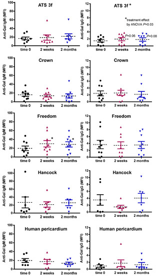 Serum anti-Gal antibody levels in adult Gal KO mice grafted with BHV tissues. Anti-Gal IgM and IgG levels were measured by flow cytometry of PAEC incubated with the various mouse sera alone or with saturating concentrations of GAS914 to set up the background. The average MFI ± SEM of anti-Gal IgM and IgG reactivity after subtracting the background of each determination is shown for each cohort of mice implanted with pieces of ATS 3f (n = 9), Crown (n = 9), Freedom Solo or Pericarbon Freedom (Freedom, n = 9), and n = 7 for Hancock II (Hancock) and human pericardium. Statistical differences were found by one-way ANOVA with Dunnett’s test as indicated for increases relative to baseline (time 0) in IgM in mice implanted with Freedom and IgG in mice with ATS 3f (* p ≤ 0.05).