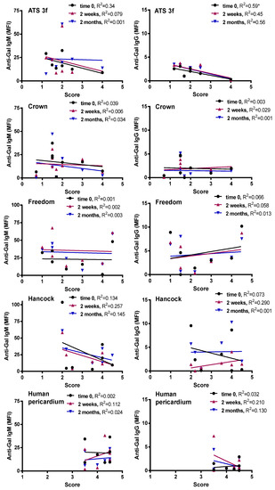 Correlations of anti-Gal antibody reactivities with histological scores in adult Gal KO mice grafted with BHV tissues. The correlation between the histological score and the MFI of anti-Gal IgM and IgG reactivity at the three time points studied was calculated for each cohort of implanted adult mice [ATS 3f (n = 8), Crown (n = 8), Freedom Solo/Pericarbon Freedom (Freedom, n = 7), Hancock II (Hancock, n = 7), and human pericardium (n = 7)]. The coefficient of determination (R2) was obtained by Pearson r (* p ≤ 0.05).
