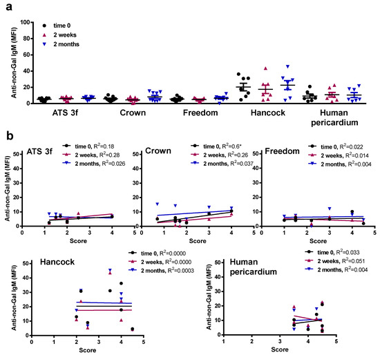 Serum anti-non-Gal IgM levels in adult Gal KO mice grafted with BHV tissues. Anti-non-Gal IgM levels were measured by flow cytometry of PAEC incubated with the various mouse sera with saturating concentrations of GAS914. Reactivity of the anti-mouse IgM antibody was used to set up the background. (a) The average MFI ± SEM of anti-non-Gal IgM reactivity after subtracting the background of each determination is shown for each cohort of adult mice implanted with pieces of ATS 3f (n = 9), Crown (n = 9), Freedom Solo or Pericarbon Freedom (Freedom, n = 9), and n = 7 for Hancock II (Hancock) and human pericardium. No statistical differences were found after applying the one-way ANOVA with Dunnett’s test. (b) The correlation between the histological score and the MFI of anti-non-Gal IgM reactivity at the three time points studied was calculated for each cohort of implanted adult mice [ATS 3f (n = 8), Crown (n = 8), Freedom Solo/Pericarbon Freedom (Freedom, n = 7), Hancock II (n = 7), and human pericardium (n = 7)]. The coefficient of determination (R2) was obtained by Pearson r (* p ≤ 0.05).