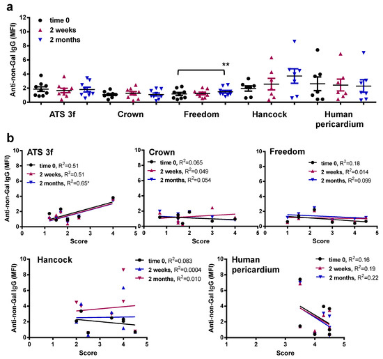 Serum anti-non-Gal IgG levels in adult Gal KO mice grafted with BHV tissues. Anti-non-Gal IgG levels were measured by flow cytometry of PAEC incubated with the various mouse sera with saturating concentrations of GAS914. Reactivity of the anti-mouse IgG antibody was used to set up the background. (a) The average MFI ± SEM of anti-non-Gal IgG reactivity after subtracting the background of each determination is shown for each cohort of adult mice implanted with pieces of ATS 3f (n = 9), Crown (n = 9), Freedom Solo or Pericarbon Freedom (Freedom, n = 9), and n = 7 for Hancock II (Hancock) and human pericardium. A statistical difference was found only with increased reactivity in mice implanted with Freedom relative to baseline (time 0) by one-way ANOVA with Dunnett’s test (** p ≤ 0.005). (b) The correlation between the histological score and the MFI of anti-non-Gal IgG reactivity at the three time points studied was calculated for each cohort of implanted adult mice [ATS 3f (n = 8), Crown (n = 8), Freedom Solo/Pericarbon Freedom (Freedom, n = 7), Hancock II (Hancock, n = 7), and human pericardium (n = 7)]. The coefficient of determination (R2) was obtained by Pearson r (* p ≤ 0.05).