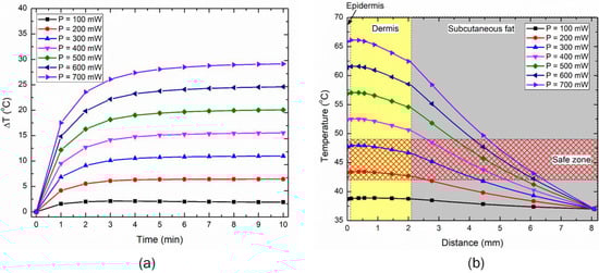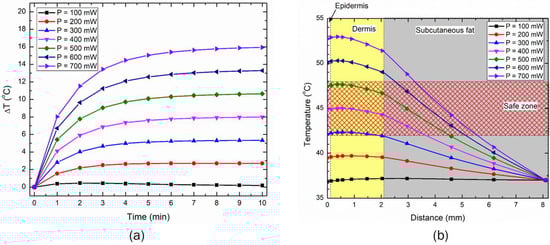 3.2. Effect of Input LED Power on Temperature Rise within the Skin