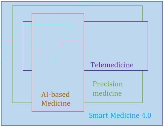 There is a global consensus about the relevance of information technology (IT) for healthcare, within which it now plays an integral part [1,2,3]. Therefore, the creation of concepts or approaches that have a significant impact on IT also has a strong impact on medical applications. The first IT-based applications in medicine were associated with the use of decision-support systems and image processing, a document management system for medical records, and the development of evidence-based medicine [4]. The concepts of big data, the Internet of Things (IoT), cloud computing, artificial intelligence (AI), and other inventions have transformed modern technologies under Industry 4.0. The development of IT in recent times has resulted in such phenomena as “precision medicine”, “smart medicine” or “Medicine 4.0” [3,5,6,7]. According to previous studies [3,5], an integral part of Medicine 4.0 or smart medicine is the use of AI-based applications in medicine (AI-based medicine), telemedicine, and precision medicine (Figure 1). AI-based medicine includes the most frequently used applications in healthcare, which allow the analysis of medical images and clinical and laboratory data. Artificial intelligence, including machine learning (ML) and big data processing, supports diagnosis and treatment in the healthcare environment [7,8,9]. Telemedicine using IoT will make seeing a patient or being seen by a clinician easier. Based on these technologies, such applications in the context of healthcare as electronic health records (EHR) [10], wearable devices (pulse oximeters or glucose monitoring) [5], and others have been developed. Precision medicine guides the course of treatment by using more comprehensive molecular diagnoses, such as genotyping or RNA expression.