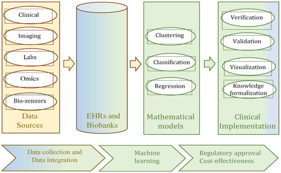 AI in the context of health is used for a wide range of problems, from retrospective to prospective analysis. The methods and approaches of AI depend on many factors, such as the goal of the analysis (for example, data description, diagnostics, prediction, or prescription), data types (numeric, discrete, time factors, etc.), uncertainty (crisp or uncertain data, whether completely or incompletely specified) and other. The taxonomy of these problems, the methods, and the specifics of the data are illustrated in Figure 2 [11]. Four groups of applications, sorted according to this taxonomy, can be identified as relevant to healthcare, and precision medicine in particular, at the present time. The first of these groups can be identified as the collection of information from repositories, EHR, or biobanks [10]. The second and third groups can be interpreted as data analysis problems; the principal methods for their decision-making processes are clustering, classification, and regression (Figure 2), i.e., methods of ML. The initial data for these methods can be collected as data from biobanks and EHRs [12]. These methods enable the extraction of clinically meaningful insights from the data. Most medical applications currently deliver services within these three groups. In other words, these are effective methods and services for data collection, representation, preliminary analysis, and processing, in order to obtain clinically meaningful information for physicians. The fourth group of applications in healthcare is mostly present in the educational domain. The different simulators typically act as learning tools for use in medical universities [13,14].