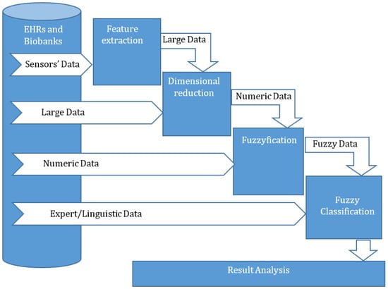 The methods used for medical data processing in precision medicine or in Medicine 4.0 should allow for the analysis of heterogeneous data (Figure 2). From the point of view of data analysis, the heterogeneity of the initial or source data is primarily associated with their processing. This process is most often defined as data pre-processing. Depending on the data type, the data can be transformed into another type, reduced, and cleared of noise and non-essential information. Depending on the procedures used in pre-processing, preliminary data can be interpreted as signals, images, high-dimensional data, numerical data, and expert data. Each type has its own pre-processing procedures. In this paper, the analysis of heterogeneous medical data according to classification is considered. A fuzzy classifier is used for the purposes of data analysis, to reduce the influence of pre-processing procedures on the classification result. The merging of different types of data is carried out by converting them to fuzzy data.