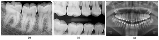 Types of X-ray images: (a) periapical X-ray; (b) bitewing X-ray; (c) panoramic X-ray.