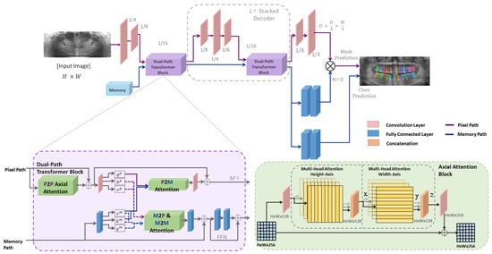 We introduce a novel architecture to effectively train and infer using the mask transformer. Unlike traditional architectures [,] where the transformer is placed on top of a convolutional neural network (CNN) [], we adopt a dual-path framework that effectively merges CNNs with transformers [,,,]. This allows CNN layers to read and write into global memory by incorporating memory-to-pixel attention (M2P), memory path self-attention (M2M), pixel–path axial self-attention (P2P), and pixel-to-memory attention (P2M). As a result, the transformer can be inserted at any position in the CNN to enable communication with the global memory at any layer. The proposed architecture also employs a stacked hourglass-style decoder [,] to aggregate multi-scale features and produce a high-resolution output, which is then multiplied with the global memory feature to predict the mask. The proposed framework significantly improves segmentation performance and demonstrates the potential to be employed for teeth numbering. Rigorously evaluated on the publicly available UFBA-UESC dental image dataset, our experimental results demonstrate that the proposed model significantly outperforms existing state-of-the-art techniques in terms of segmentation performance and robustness.