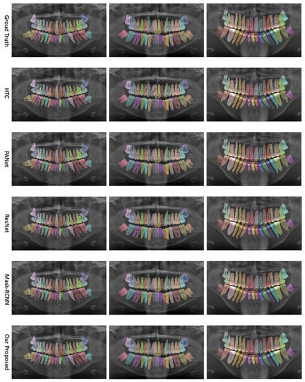 Recently, deep learning (DL)-based techniques have garnered attention across various industrial applications due to their impressive performance [,,]. These applications span object classification [], segmentation [,,], counting [], medical image enhancement [,], and object detection []. Specifically, in tasks such as object detection and segmentation, DL-based methods have revolutionized the field []. As a result, several DL-based techniques have been employed to enhance teeth segmentation in dental panoramic X-ray images. While some studies have focused solely on the semantic segmentation of teeth, limiting the level of detail for further processing steps in most automatic dental analyses [,,], others have identified teeth alongside segmentation, providing more information for automatic analysis. However, these instance segmentation techniques, which typically consist of two stages, ROI/fuzzy boundary detection and teeth segmentation, increase the complexity and are more prone to errors due to their cascading nature. The errors from the first stage can propagate to the second, limiting the performance of these methods. Additionally, the information obtained from instance segmentation may not be sufficient for a comprehensive teeth analysis, as apart from intra-teeth segmentation, it is crucial to accurately segment the teeth from other oral tissues.