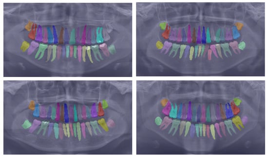 Numerous attempts have been made to develop a highly accurate automatic teeth segmentation algorithm [,]. However, teeth segmentation remains challenging due to fuzzy boundaries caused by low contrast and noisy dental panoramic X-ray images. The diversity of teeth conditions across different patients and the presence of dental instruments, such as metal racks and dental implants, pose significant obstacles to achieving accurate teeth segmentation. Recognizing these challenges, this research introduces a novel approach based on panoptic segmentation []. Panoptic segmentation unifies the typically disjoint tasks of semantic segmentation (identifying and classifying objects in an image) and instance segmentation (segmenting individual instances of each object), offering a more holistic and precise tooth and oral tissue segmentation strategy [,]. Several studies have shown the effectiveness of panoptic segmentation for optimizing the performance of deep-learning-based models [,,,].