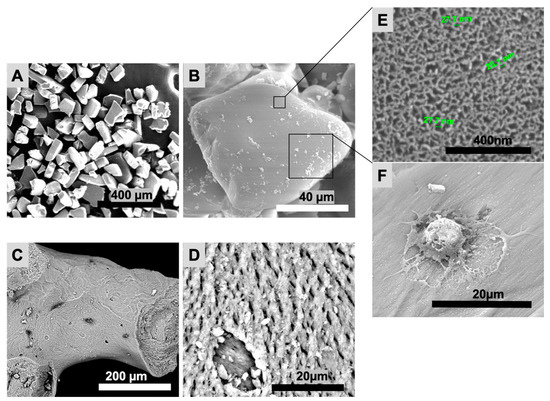 Scanning electron microscopy (SEM) of pSi and XBS particles. (A,B): pSi particles. (C,D): XBS particles. (E): pSi surface at high magnification, showing the nanoporous structure. (F): DPSC on pSi with formation of protrusions out of the cell membrane.