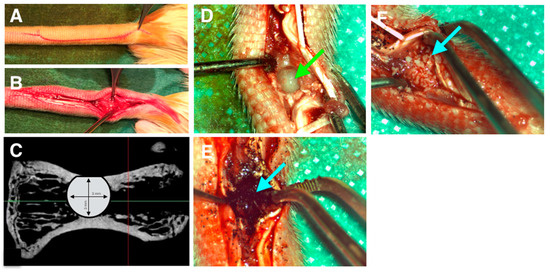 Surgical procedure. (A): skin incision. (B): skin and muscles retraction. (C): critical size defect plan on retro-alveolar radiograph. (D): calibrated bone defect on vertebrae. Green arrow indicates empty defect. (E): defect filled by porous silicon particles. (F): defect filled by XBS. Blue arrow indicates filled defect.