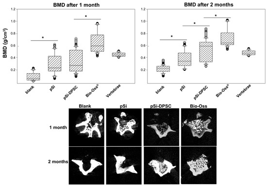 Analyses by µCT after 1 and 2 months. Upper part: Bone mineral density comparisons between every test and control at 1 and 2 month of healing. * represents significant differences. Lower part: µCT slices of defect filled by pSi particles, pSi particles with DPSC, XBS particles and negative control, after 1 and 2 months.