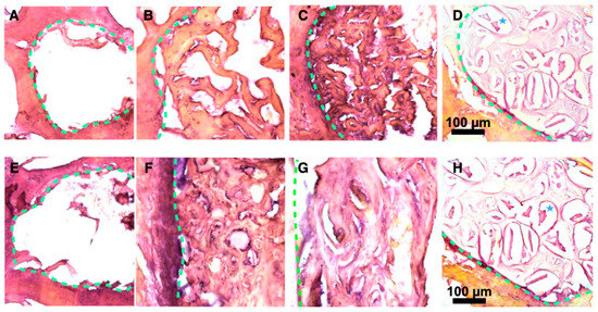 Histological slices after 1 and 2 months ((A–D) and (E–H), respectively). Slices were stained with Hematoxylin-Eosin. (A,E) Blank defect. (B,F) pSi particles. (C,G) pSi particles with DPSC. (D,H) XBS granules. PSi particles are not visible after 1 or 2 months. Dash lines represent junctions between original bone and new bone. Blues stars represent demineralized XBS particles.