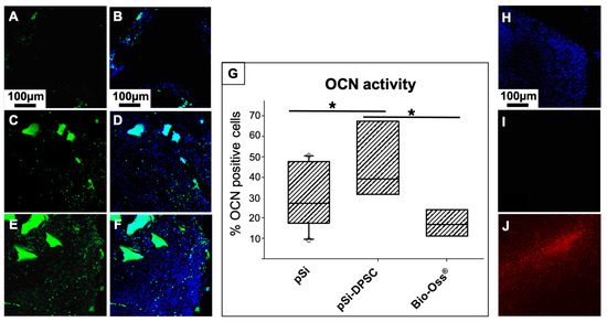 Osteocalcin (OCN) activity: Fluorescence images of bone defects after 1 month of healing, filled with XBS particles (A,B), pSi particles alone (C,D), and pSi particles carrying DPSC (E,F). OCN is stained in green (A,C,E), and corresponding merged image with cell nuclei stained in blue are presented in (B,D,F), respectively. The box plot graph (G) represents OCN activity, measured as a percentage of positive cells. * represents significant differences. (H–J) HuNu staining on slices from vertebrae after 1 month of healing to highlight the presence or absence of human DPSC: (H) Nuclear staining (DAPI) in blue showing the presence of cells, (I) HuNu labelling in red (no signal visible) enlightening the absence of human cells, (J) Positive control of HuNu labelling efficiency (red) on human cells confirming that the absence of signal corresponds to an absence of human cells.