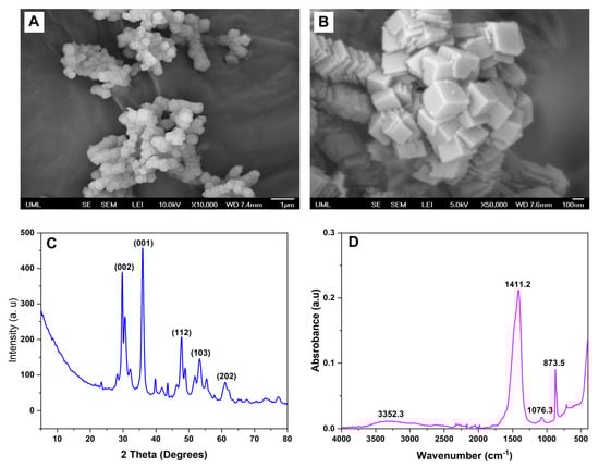 SEM images showed that the CPN had a cubical morphology with a size range from 74 to 114 nm (Figure 3A,B). The nanoparticles were found to be well dispersed and agglomerate-free. The nanoparticles had a relatively uniform size distribution, with no evidence of any significant size variation within the sample.