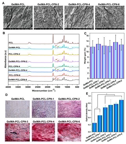 The morphology of the scaffolds was characterized using scanning electron microscopy (SEM). SEM images of the GelMA-infiltrated PCL scaffolds showed that the surface of the scaffolds was smooth and free of defects (Figure 4A). Overall, the infiltration of electrospun PCL–CPN scaffolds with GelMA resulted in a significant change in fiber diameter and morphology. The GelMA-infiltrated PCL scaffolds had a smoother surface and larger fiber diameter distribution, which may have implications for their mechanical properties and biocompatibility.