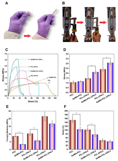 Figure 5 illustrates the tensile mechanical testing results of the electrospun PCL scaffolds loaded with CPN and scaffolds subsequently infiltrated with GelMA. The addition of GelMA into the pores of the PCL–CPN matrix significantly impacted the mechanical behavior of the resulting scaffolds, leading to an improvement in their mechanical properties (Figure 5A).