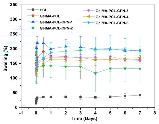 Swelling behavior comparison of GelMA–PCL and GelMA–PCL–CPN scaffolds in PBS.