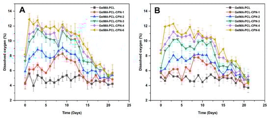 Release of oxygen (O2) from the GelMA–PCL–CPN scaffolds under hypoxia for 21 days. (A) Graph showing the release of oxygen from the cell-free scaffolds. (B) Oxygen release from the cell-seeded scaffolds.