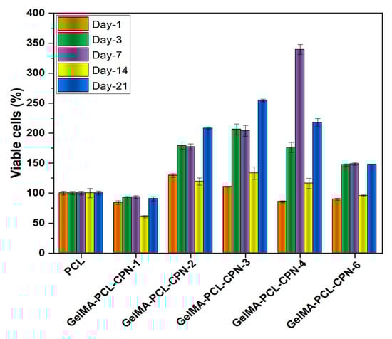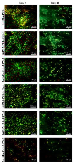 In order test our hypothesis, we cultured pre-osteoblast cells on GelMA–PCL as well as GelMA-PCL–CPN scaffolds under hypoxic conditions for 21 days. MTT cell viability assay showed that the composite GelMA-PCL–CPN scaffolds provided higher amount of cell proliferation under hypoxic conditions (Figure 8). In addition, the number of viable cells which attached and proliferated on the GelMA-PCL–CPN scaffolds were greater than that of the blank GelMA–PCL scaffolds (Figure 9). Specifically, 2 to 4% w/w CPN loading in the scaffolds resulted in the proliferation of large number of pre-osteoblast up to 21 days. However, a higher loading of CPN in the scaffolds resulted in a decrease in cell proliferation and viability, as demonstrated in the case of GelMA-PCL–CPN-6. This can be attributed to the potential adverse effects of CPN at higher concentrations, as reported in various studies []. Specifically, a significant number of dead cells were observed on day 7 for GelMA–PCL–CPN-6. Additionally, the overall cell density on GelMA–PCL–CPN-6 was considerably lower at 21 days of the study. This decrease in cell density on day 21could be attributed to the detachment and loss of dead cells from the scaffolds during the extended culturing period and the necessary media changes.