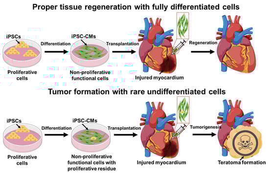 The use of stem cells as a therapeutic agent for tissue regeneration holds great promise, but it also comes with potential risks, such as graft-versus-host disease [] and tumorigenicity [] (Figure 1). The self-renewal properties of stem cells can lead to uncontrolled proliferation and tumorigenicity. On the one hand, undifferentiated PSCs can robustly form teratoma—a type of stem-cell-derived cancer-in animal models []—and therefore, PSCs must be sufficiently differentiated into non-pluripotent cell types for therapy. However, it is common that a small number of undifferentiated PSCs will persist in the differentiated cell populations. According to the observation, these rare undifferentiated PSCs presented in the differentiated cell populations can still develop into teratomas [] or cysts [], which poses a significant safety concern for PSC-derived therapy. In one case report, a 49-year-old patient with type 2 diabetes received iPSC-derived beta cells as therapeutics and developed a mass with enlarged axillary lymph nodes at the injection site within two months []. Most cells in the mass were further confirmed to be OCT3/4 and SOX2 positive, demonstrating their potential origin from PSCs.