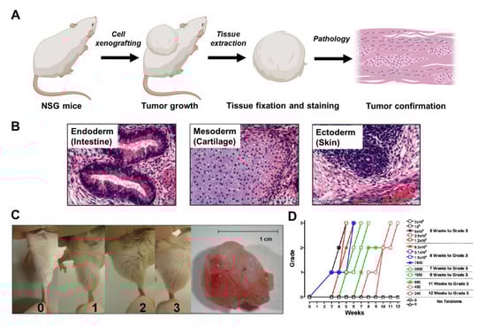 Assessment of tumorigenicity by animal models. (A) Workflow of cell xenografting and tissue quantitation. (B) Representative H&E images of teratoma containing the tissues derived from three germ layers. (C) Development of a simple grading system for visualizing growing tumors. The grading scale is as follows: 0 = no teratoma, 1 = teratoma just visible, 2 = teratoma visible, 3 = large teratoma with a typical size > 1 cm. (D) Quantitation of tumorigenicity of rare ESC spiked in non-proliferating feeder cells. Images reprinted from [] with permission.