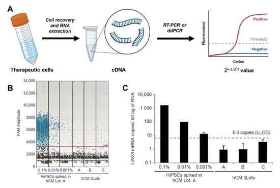 Assessment of tumorigenicity by PCR. (A) Workflow of RNA extraction, cDNA synthesis and their use in RT-PCR procedure to determine the gene expression (B) Raw data from ddPCR showing the expression of LIN28 mRNA in cardiomyocyte samples with different numbers of spiked-in ESCs. The threshold for positivity was assigned manually. FAM: 6-Carboxyfluorescein. (C) Raw data from ddPCR showing the copy numbers of LIN28 mRNA in 50 ng of total RNA. The threshold of the lower limit of detection (LLOD) is determined manually. Images reprinted from [] with permission.