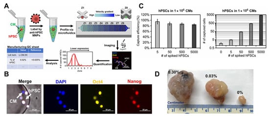 An example of a magnetic cell sorter is the Stem Cell Quantitative Cytometry (SCQC) system (Figure 4) []. The SCQC workflow involves three major steps: MNP labeling, microfluidic capture, and microscope quantification (Figure 4A), with a total duration of approximately two hours. In brief, cell mixtures are labeled with MNPs that target TRA-1-60, a protein marker specific to human pluripotent stem cells (hPSCs) on the cellular membrane. Labeled cells are then introduced into the microfluidic device equipped with external magnets and capture pockets. Tumorigenic hPSCs are selectively captured on the device, while other differentiated phenotypes are flushed out to the reservoir. The captured cells are then stained with other pluripotency markers, including OCT4 [] and NANOG [], for confirmation (Figure 4B). Finally, the captured and stained cells are quantified under the fluorescence microscope, and the percentage of rare cells is calculated by normalizing to the number of input cells. The SCQC system achieves remarkable sensitivity (0.0005%, 5 cells) with a low input cell number (1 million cells, Figure 4C), demonstrating robust discrimination of undifferentiated hPSCs against cardiomyocytes and definitive endodermal progenitors. The outcomes of SCQC match well with the independently performed teratoma formation results from animal models (Figure 4D).