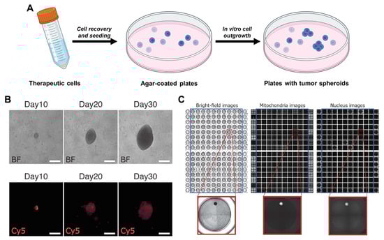 Assessment of tumorigenicity by soft-agar assay. (A) Workflow of colony-based assessment of rare tumorigenic cells. (B) Representative images of Cy-5 labeled HeLa cells spiked in human mesenchymal stem cells. Due to its tumorigenic nature, HeLa cells form significantly bigger colonies over 30 days’ culture. (C) Images of automated detection of the colony formed by the single HeLa cells spiked in human mesenchymal stem cells. The mitochondria images were achieved by staining the wells with MitoTracker. The nucleus images were captured by staining the wells with Hoechst 33342. Images reprinted from [] with permission.